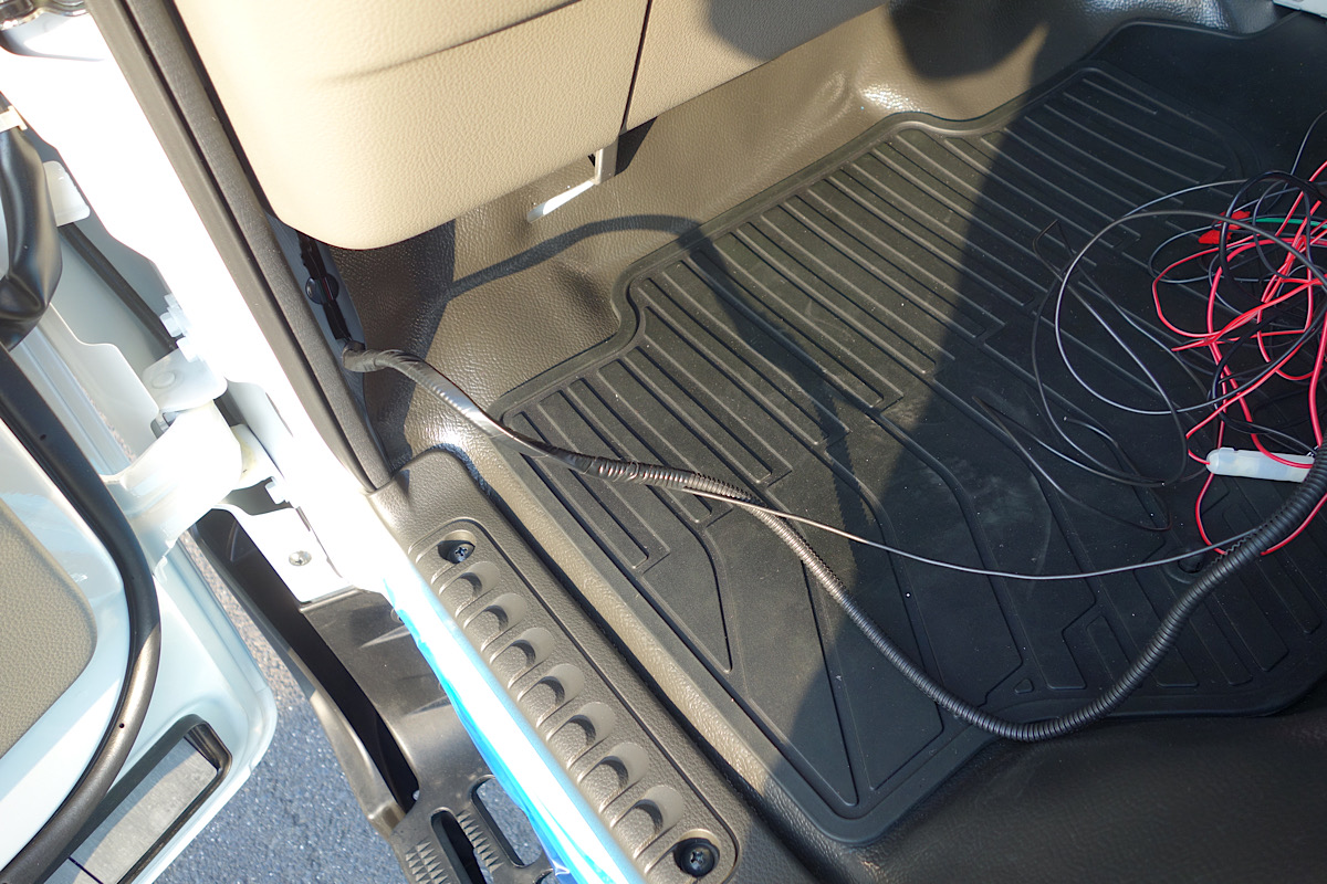配線にコルゲートチューブ巻いて寝板を使って車の下回りを地道に配線を止めて行き車内まで引き込み