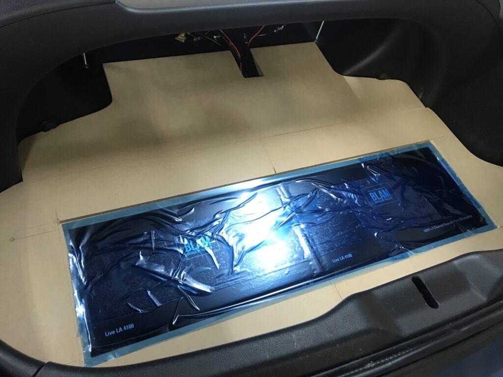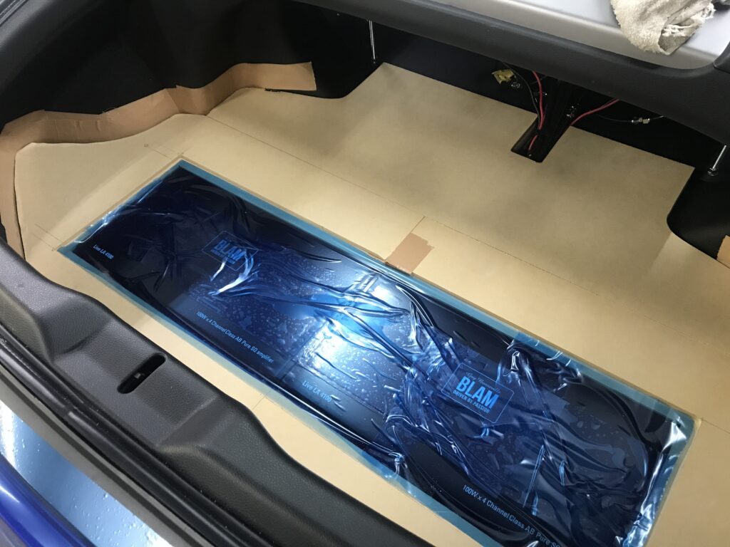 アンプも固定したので化粧パネル作っていきますが土台となる下が配線ジャングル、横に長いパネルを作るので配線をかき分け柱を立ててパネルを載せます
