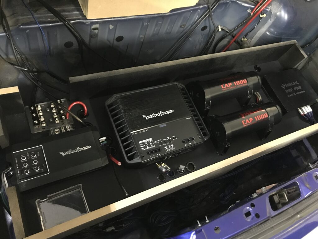 手前からアンプ、アンプ、キャパシター、DSPの順で並んでますがDSP、キャパシター、アンプ、アンプの並びが都合よかったと後悔