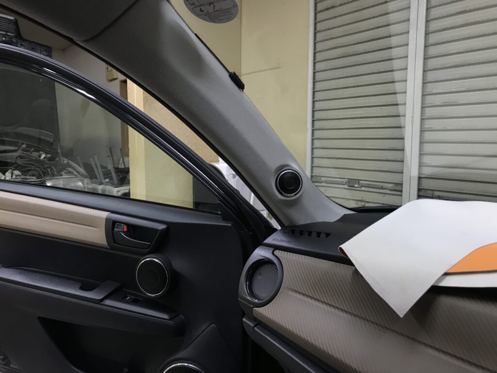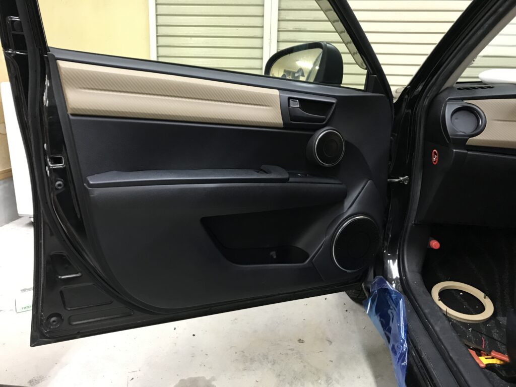 ミッドバスのアウターバッフルは純正トリムのおにぎりグリルを隠すために大きくなりましたが黒のトリムに黒のレザーなんで違和感はないんじゃないかな