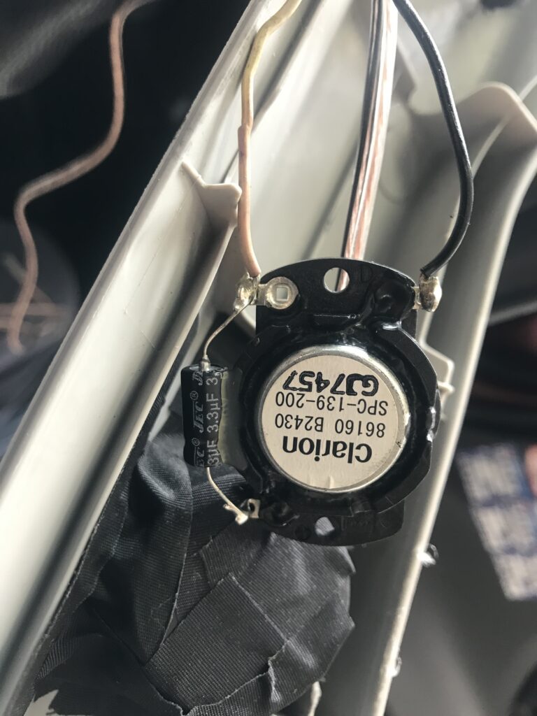 Clarionのトィーターが純正で黒のテープで囲われているのがソニックのトィーター、トィーターはホットボンドで固定なので取れないようにテサテープで補強してます(^^)