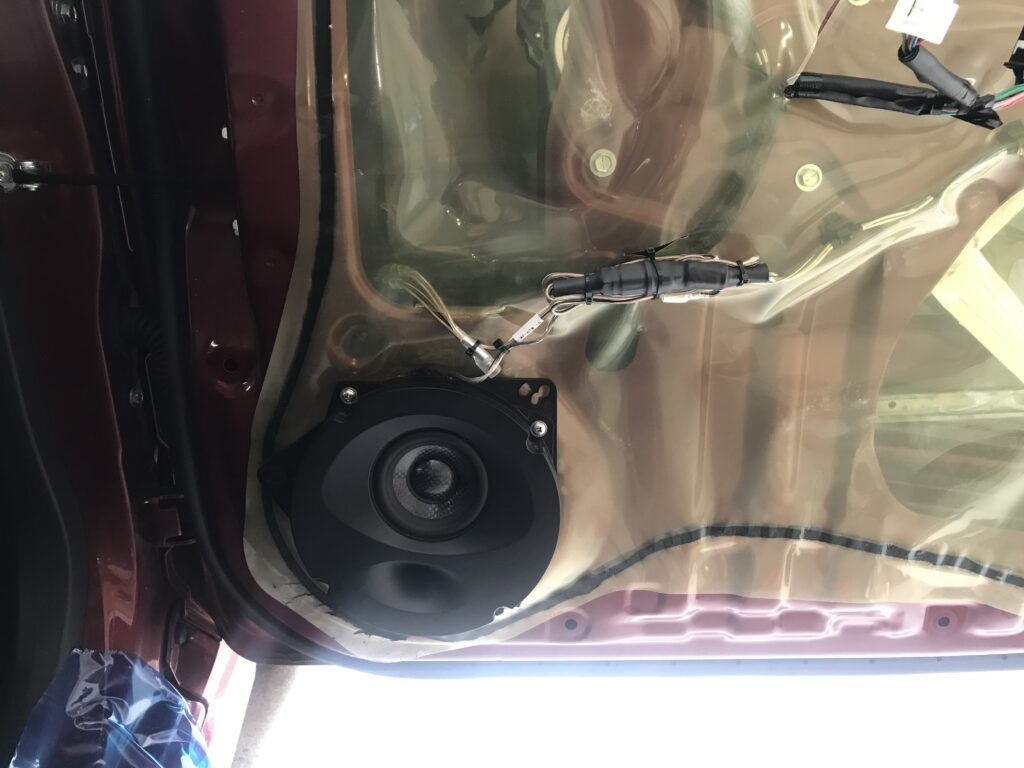 純正のスピーカーが入る穴が小さいので鉄板を切り装着、エンクロ設計のスピーカーなのでデッドニングは無し