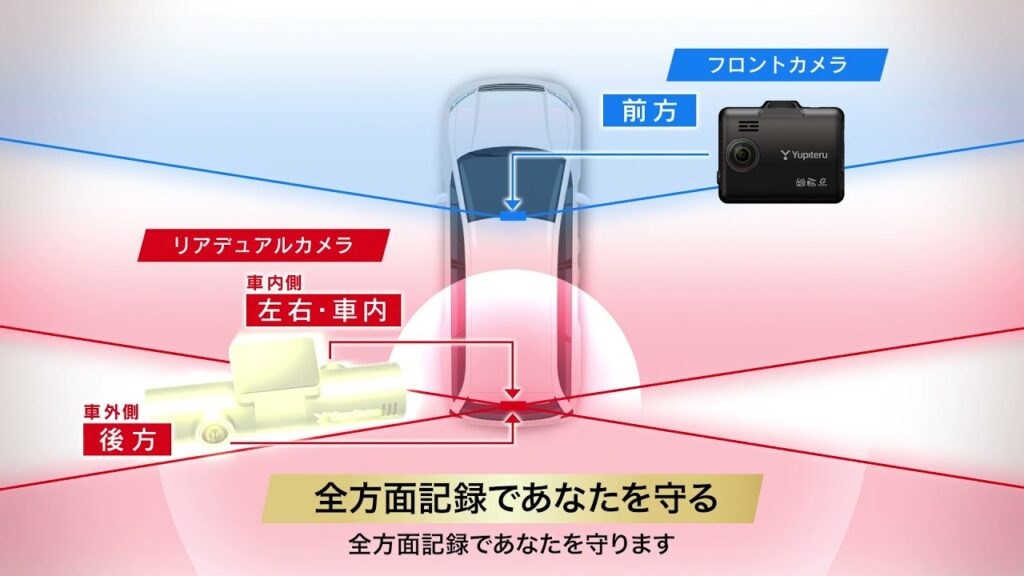1つは後方を撮影もう1つは後ろから室内に向けて前方を撮影し全方向を撮影します
