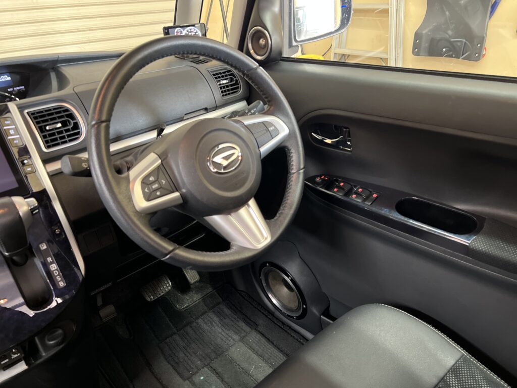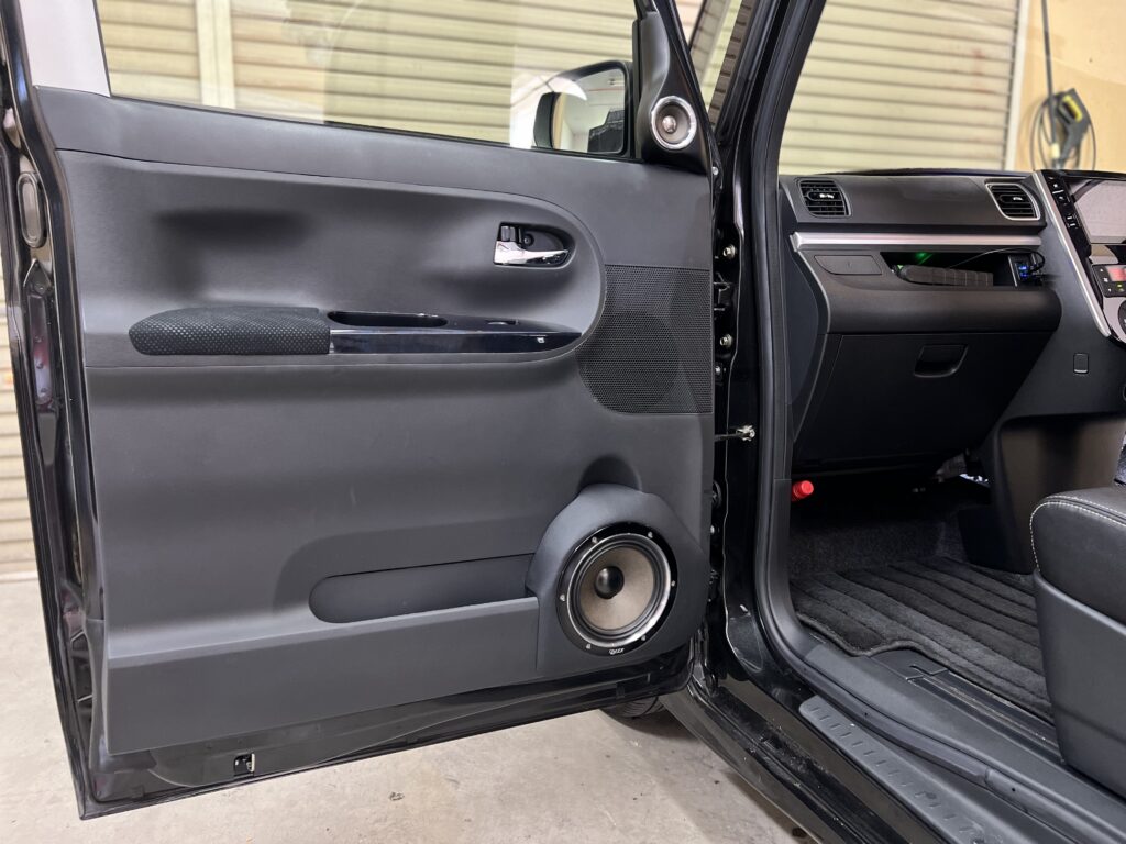 ドアミラー裏に付いてるスピーカーは見た目はミッドレンジみたいですがトィーターです!純正風に艶消し黒の塗装で仕上げですがトィーターが大きいので純正チックには見えませんがなるべく違和感ないように製作