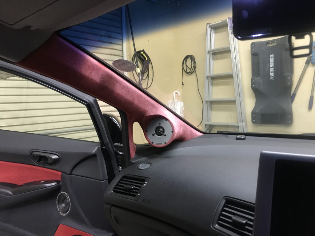 そんなシビックさんトィーターだけ正面向いてる角度を真横に変更します、店内でスピーカーBOXを横に向けたり正面に向けたり定位などを確認したのち車でも実験して