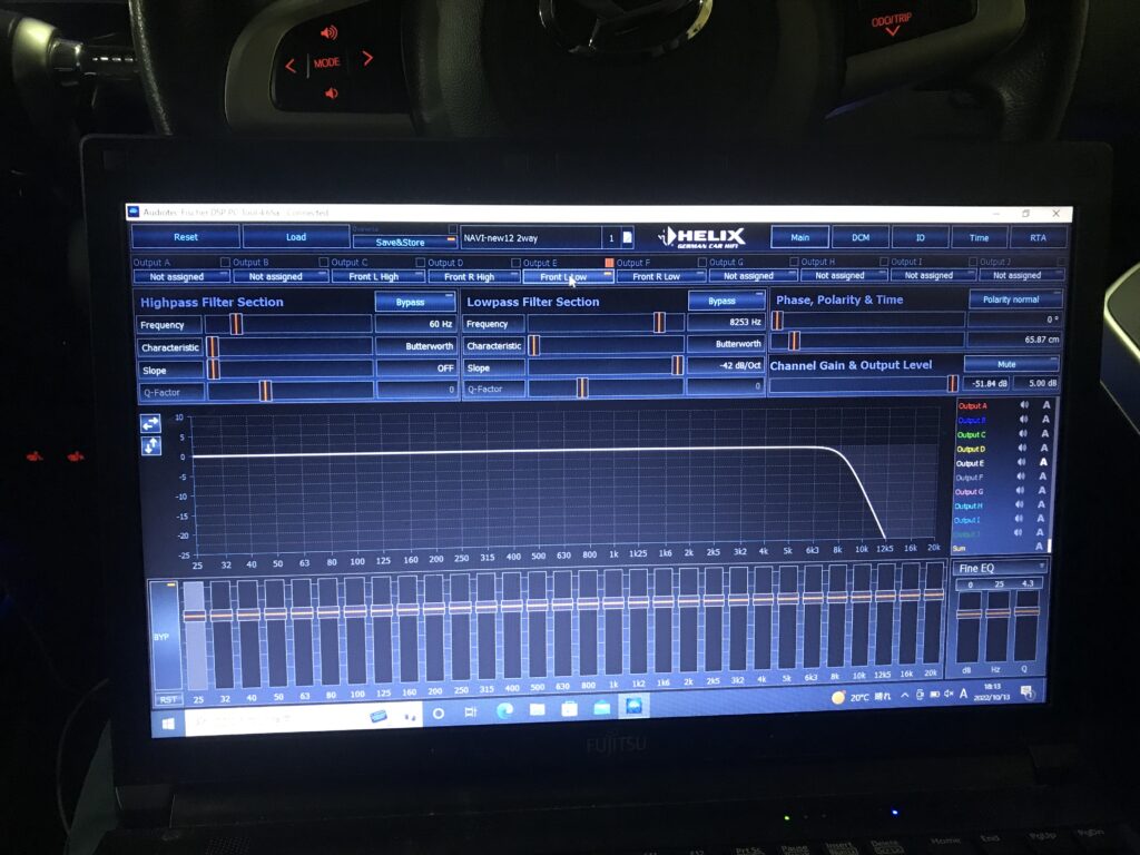僕はトィーターとミッドウーファーのクロスは一番きついスロープできります。ここら辺がアナログネットワークとデジタルネットワークの違い、今回のセッティングはお客さまには初めてするセッティングで顔を前方に傾けても音色変わらずボーカルの大きさも変わらず定位してます(右にはよりますが)左右に顔を振っても傾けた方に追尾しこちらも音色変わらずボーカルの大きさも変わらずに定位し右側でセッティングしたデータを反転させれば助手席側のセッティング完成です。何が言いたいかと言うときっちり合ったスピーカーのホームオーディオと同じて事です