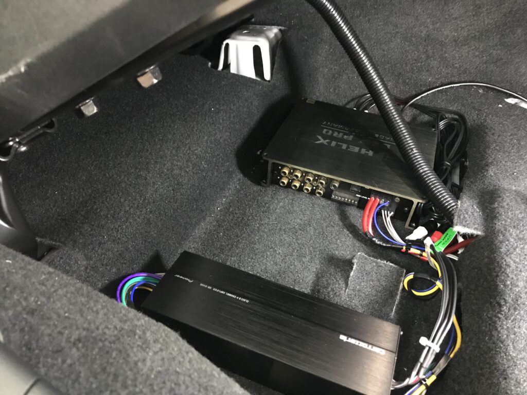 アンプはカロッツェリアのGM-D1400Ⅱ、このぐらい小型だと設置場所にも困らないのが利点!価格も17,600円で安くこの音ならコスパ十分です。カロッツェリアのアンプは好きですがこの上のD級は好みじゃないね他一同は良い、99・09のf特の良さは惚れ惚れしますがデモカーのアンプはブラックスです(笑)