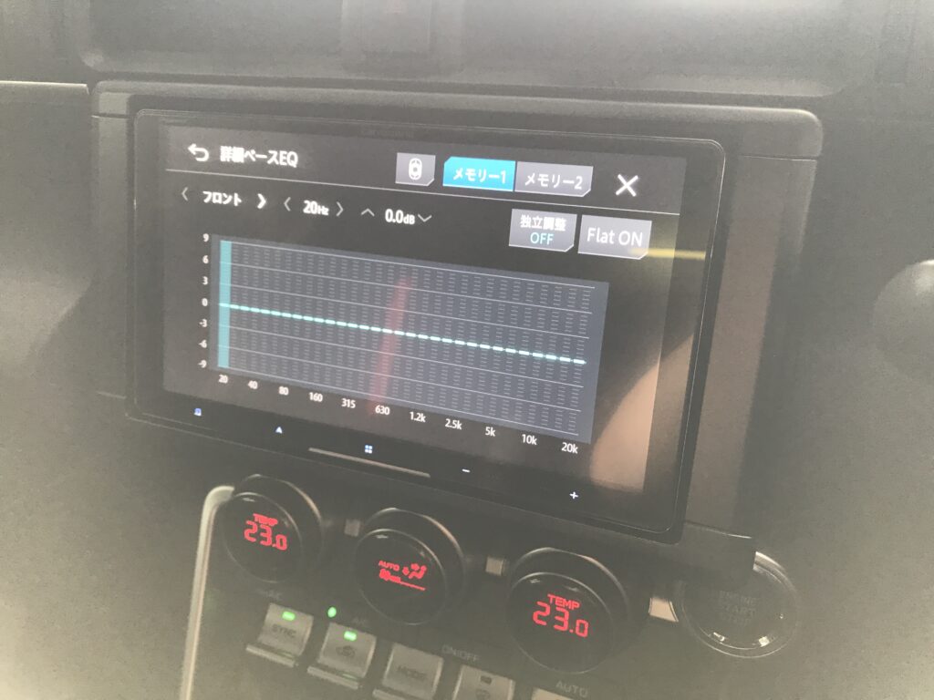 次はセッティング、音流したらが低域凄い!一瞬えっと思いましたが純正サイバーナビ側がいじられてたので全てフラットにしてから調整。サイバーナビ使ってたら詳細EQだっだかな、ここでEQフラットONしたほうが良いですよ、EQスルーになるのでCPUの負担が軽減され音良くなります