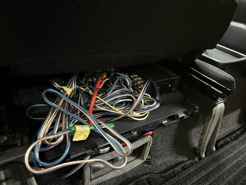 助手席シート下に配線の固まり!助手席シート下だけでは収まらないので運転席下と機器を分けて取り付けしていきます