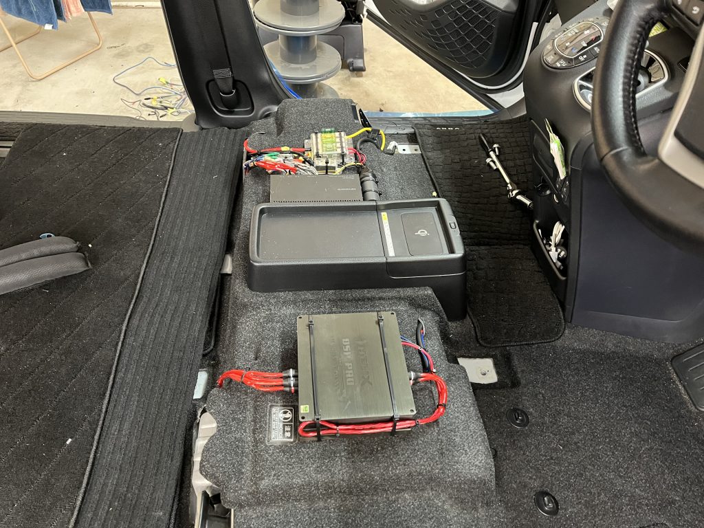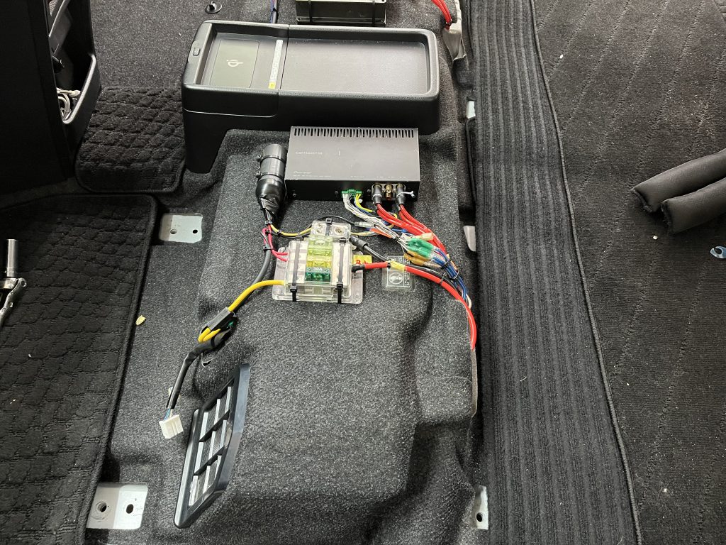 合間ぬって作業してるノアさん、何が合間なのか?どっちが合間なのかわからないですがDSPなどの配線していきます。助手席下にDEH-P01のアンプとヒューズブロックなど