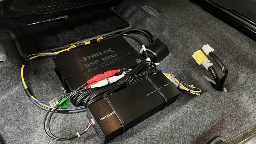 この前取り付けた時に楽ナビの音声信号、スピーカーまでのスピーカーケーブル、電源線を運転席下まで引いていたので運転席下だけの作業になります。軽自動車で狭いですがDSPはDSP-MINIだしアンプはカロッツェリアのミニアンプGM-D1400Ⅱなのでスペースも余裕