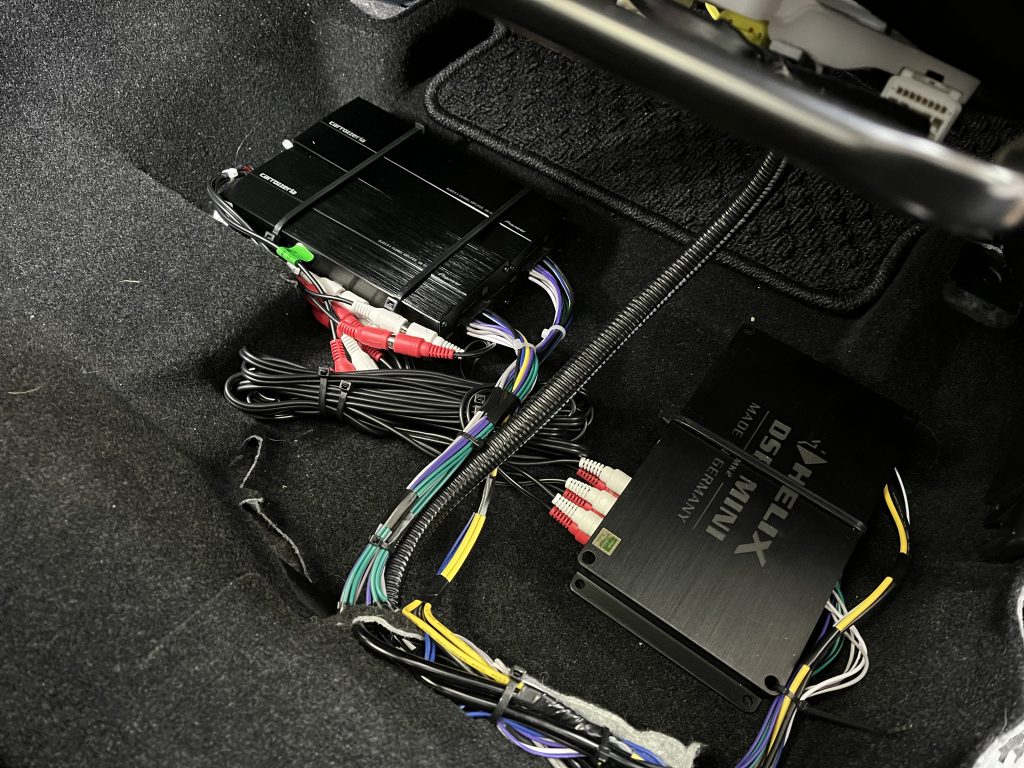 DSP-MINIにカロッツェリアのミニアンプGM-D1400Ⅱ、初めてDSPを付けるお客様の定番コンビ!この車はリアスピーカーも鳴らすのでGM-D1400Ⅱを2台使用、スピーカーは交換してあったのでデッドニングとDSP取り付けになります