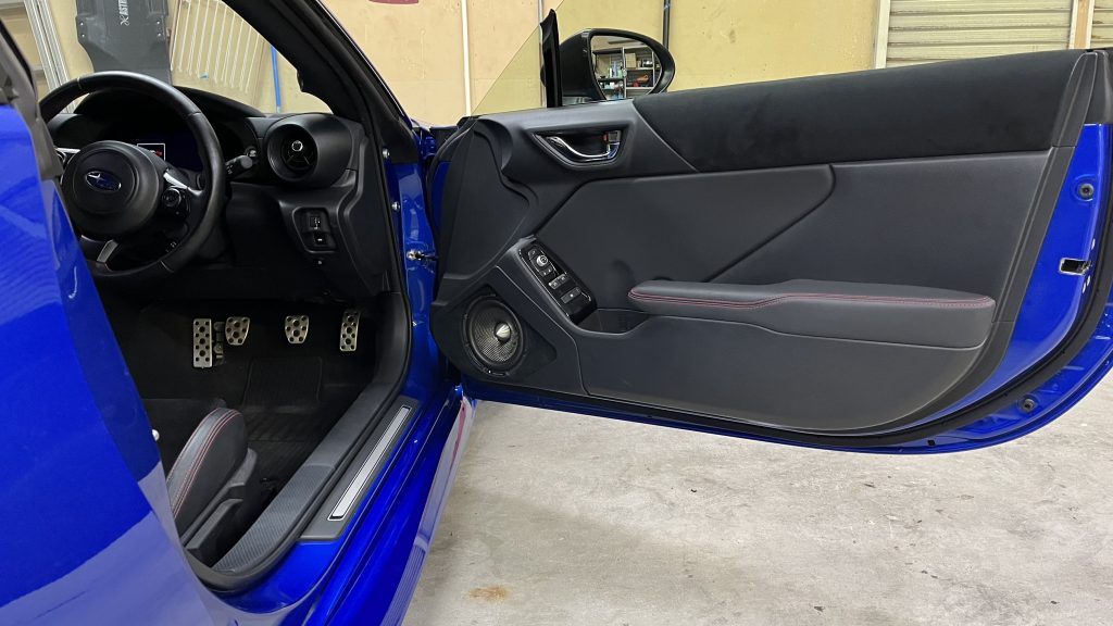 BRZのスピーカー開口部はとにかく狭くインナーバッフルをずらしベストな位置に移動してからアウターバッフルを制作。ドア下部分を純正トリムのラインに合わせるためアウターバッフルを削りに削ってなんとか自然に見えるように仕上がりました