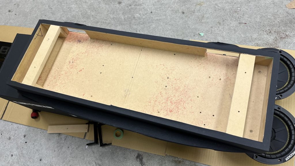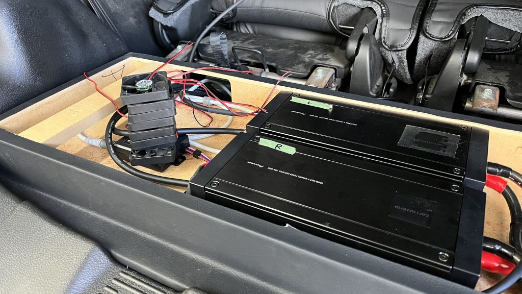 このサブウーファーBOXの下にアンプ2基、その下にアンプ3基その下にDSPが取り付けてあります。去年までは暑くても問題なく作動してたのですが2時間ぐらい運転してるとまずサブウーファーが鳴らなくなり次にミッドウーファーが鳴らなくなりミッドレンジとトィーターだけ鳴ってる状態に、完全に熱でアンプが止まってるので冷却ファンを入れます。冷却ファンの数は8個