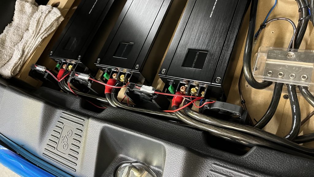 DSP・アンプ5基を積み重ねて取り付けしているスペーシアカスタム
