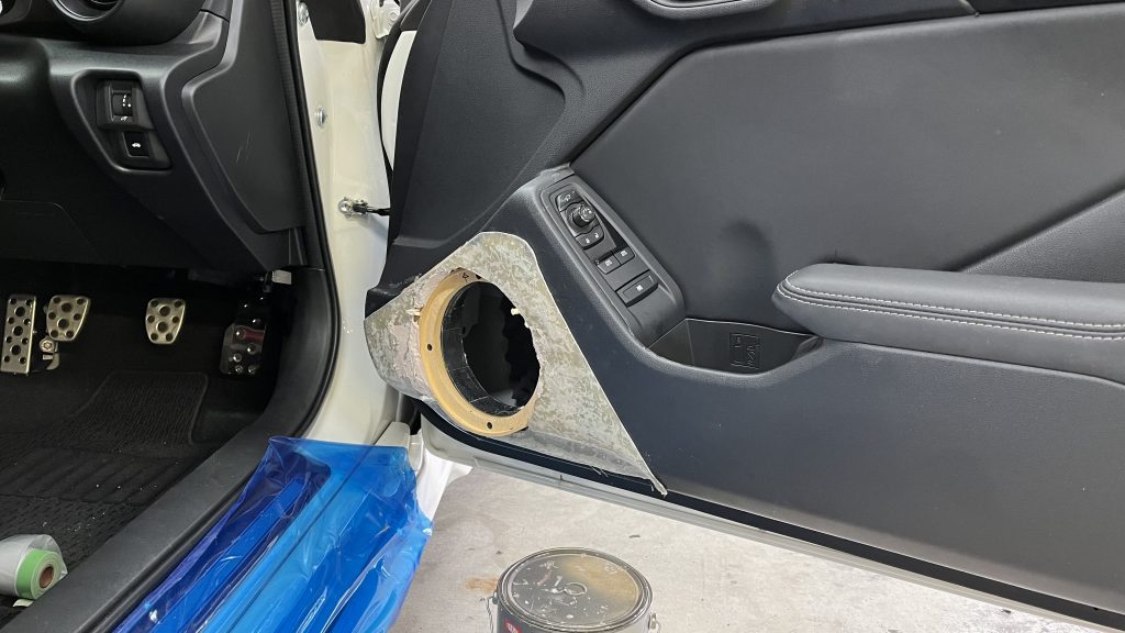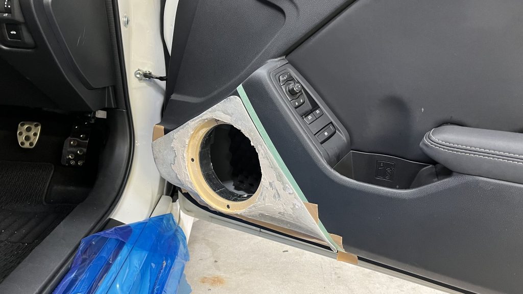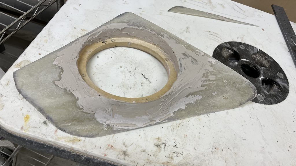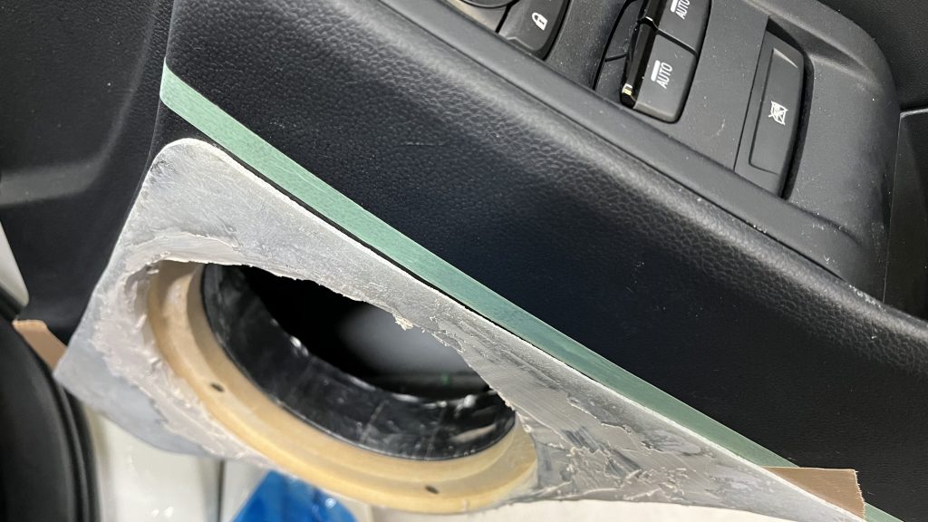 接着剤とバテを使って荒く整えていきます。車から外して削ってさらにパテ