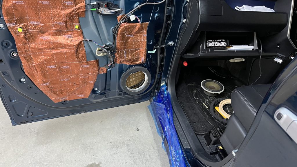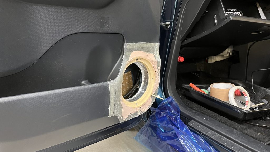 円のインナーバッフルなので鬼目ナットを使って裏からボルトで固定、内側はアルミテープで防水しています。インナーバッフルに樹脂を染み込ませて防水対策とかもしてましたが経年劣化で割れたりするのでアルミテープを採用、車で一番ベストは金属です。洗車や雨の時はドアの中は水浸しなので長く使うなら金属のインナーバッフルをお勧めします