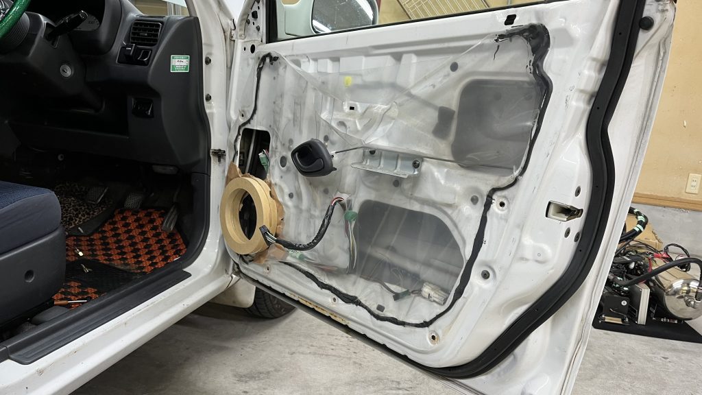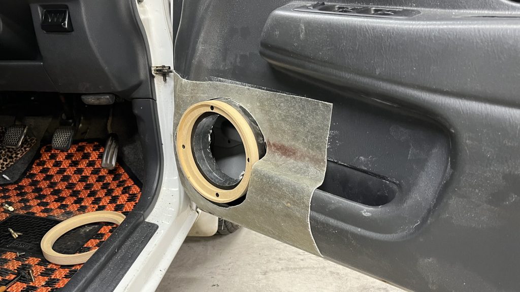 時間が空いたのでキャロル再開、凸凹のドアにインナーバッフルを取り付けます。位置決めしてから鉄板を切りドアにガムテープを貼り