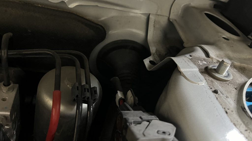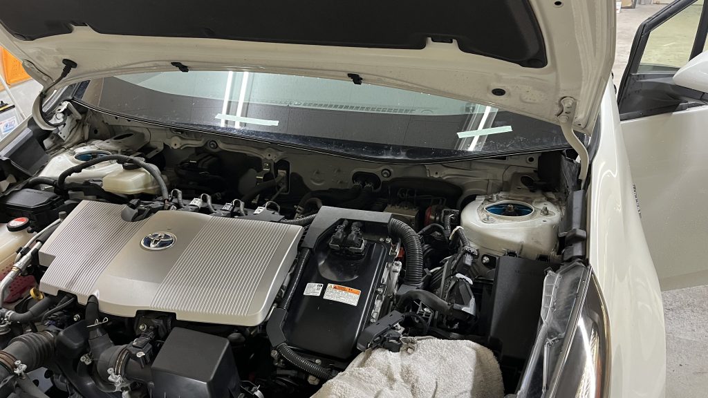 プリウスはバッ直するのにバルクヘッドも外さないと車内にケーブルが引き込めないのでバルクヘッド・ワイパーモーターなど全て外します。プリウスだけじゃ無いですけどね最近の車は多い