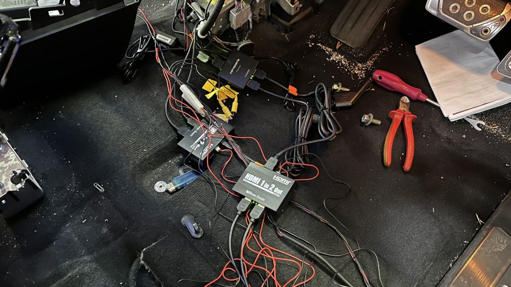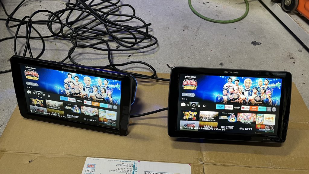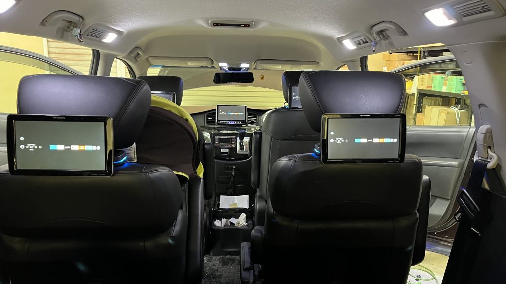 現在リアモニター2枚付いてますが増設でもう2枚追加で4枚計画!ナビから出ているHDMI出力を分配器に入れ更に分配器を2個追加で合計4枚。映ってくれることを祈って分配器を仮設置で試してみます