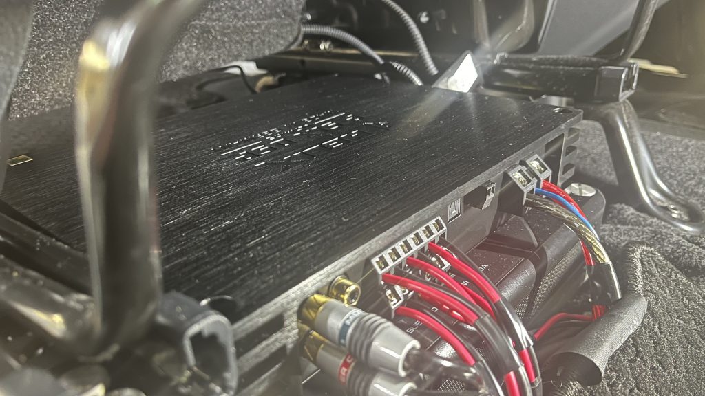 運転席シート下にはサブウーファーが入ってるので助手席側に入れたいですがタントは助手席の可動域がとても大きくて無理なので運転席に入れます。寸法的にはギリギリ入るのでサブウーファーの上に取り付けます