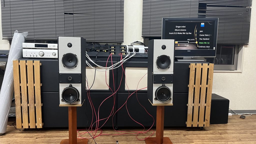 デモボードに赤いスピーカーケーブル付けてどんな感じか聴いてます!