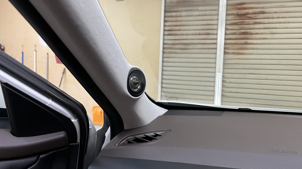 トィーターをダッシュボード置きでしたがどうしても気になるようでピラーに埋め込みます。埋め込んだ方がスッキリしますよね