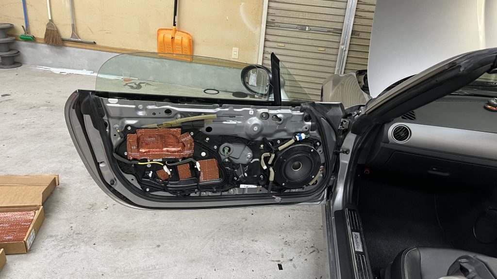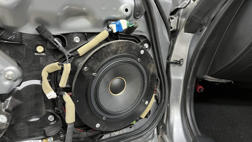 少し前のマツダ車はドアのコネクターを外すのが辛く手こずります。コネクターの内部を削ってスピーカー線をドアの中まで引き込みコネクターを車両に戻しドアは完了。この時点で指が痛くなってます