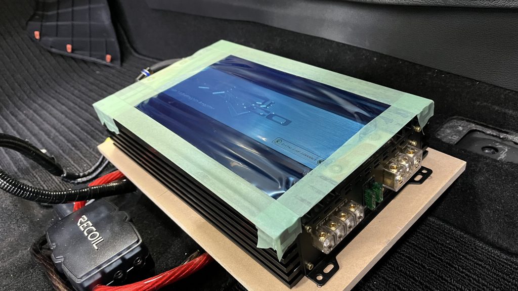 これをシート下に入れます。まずはアンプが載るボードを作りシートとアンプが干渉しないか配線は上手く弾けるかを確認
