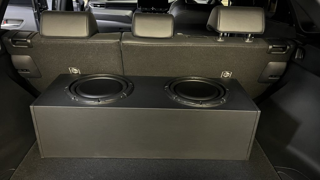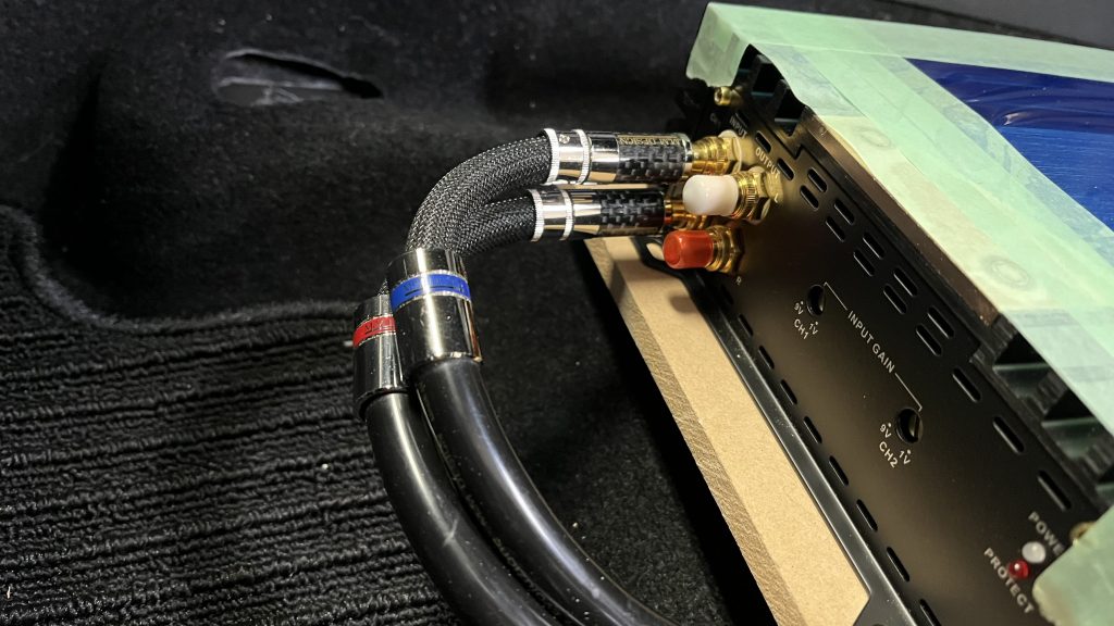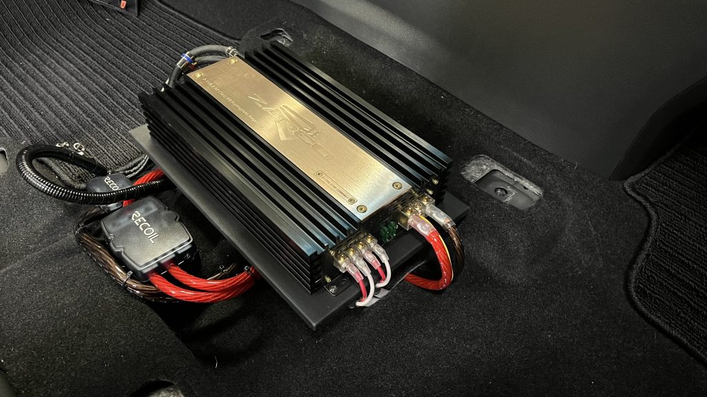 ハリアーにサブウーファーの取り付けです。アンプはザプコのZ150.2AP、DSPから繋ぐRCAはM&Mデザインの7N-MA9000コルサ、スピーカーケーブルはアクロリンクの7N-1010とお客様のこだわりの強い豪華な仕様!