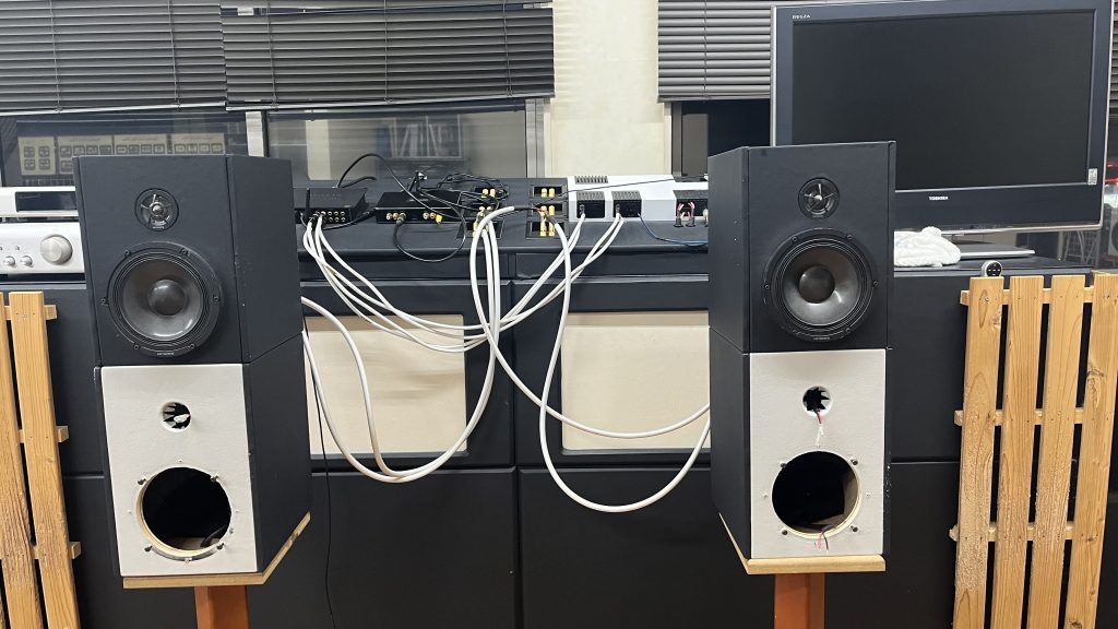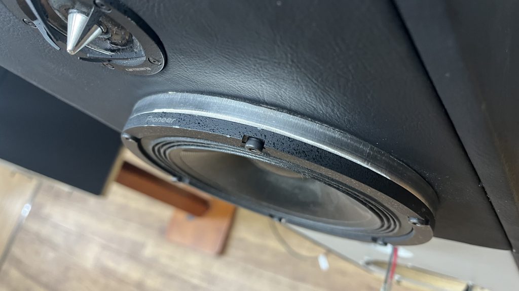 箱は既存の物を再利用するのでトィーターの穴は大きく開け直してミッドウーファーは普通のサイズより大きいのでRS用のリングに取り付けてます。リングはジュラルミンだったけかな?昔いろんな素材で作ってたので素材はわからない
