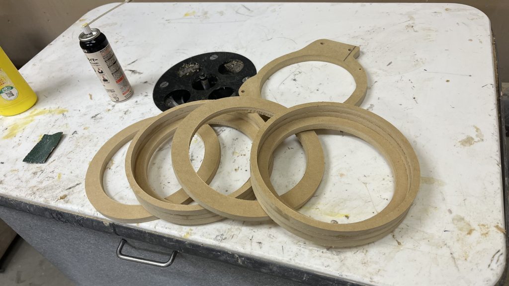 インナーバッフルとアウターバッフルを作り直すのでベースとリングを制作、PCD-1とグリルを装着するのでリングは1mm単位で異なる物を作ります