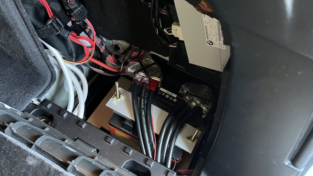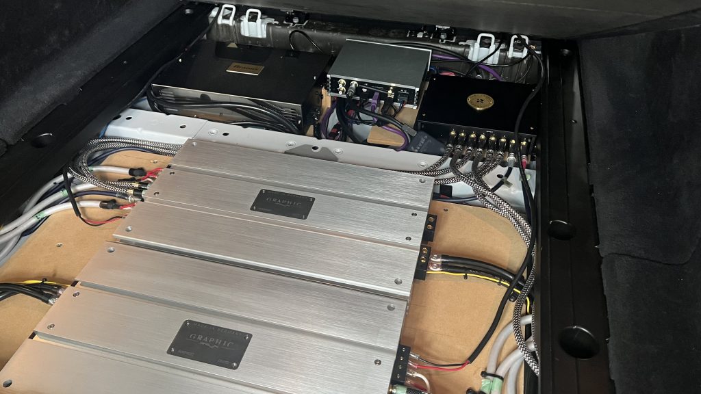 安定化電源からサブバッテリーに入り各オーディオ機器に電気を送ってますので車両の安定しない電源から遮断。ノイズはほぼ電源からなのでSNは格段に向上します。ブレイムスは左奥ね