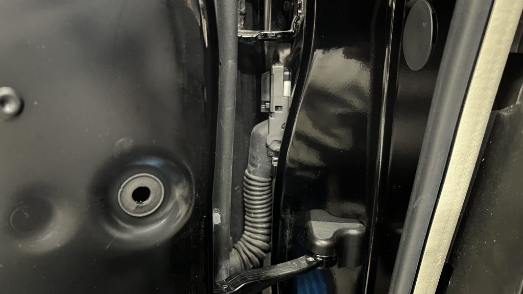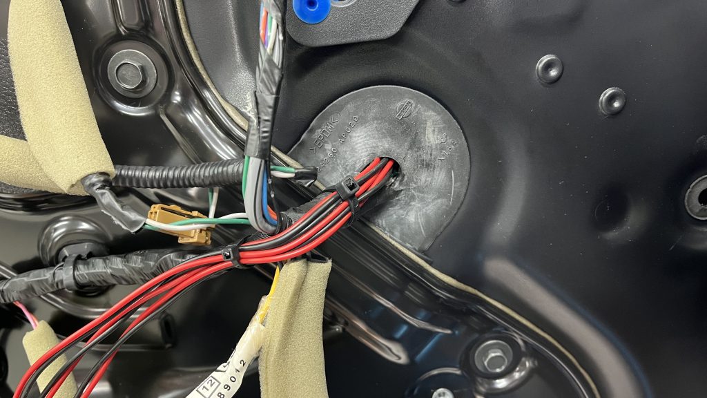 日産はドアに繋がるところがコネクターでドアに通線が非常に困難、細いスピーカーケーブルなのでコネクター削ればなんとか出来るだろうとコネクターを外すと、これは無理・・