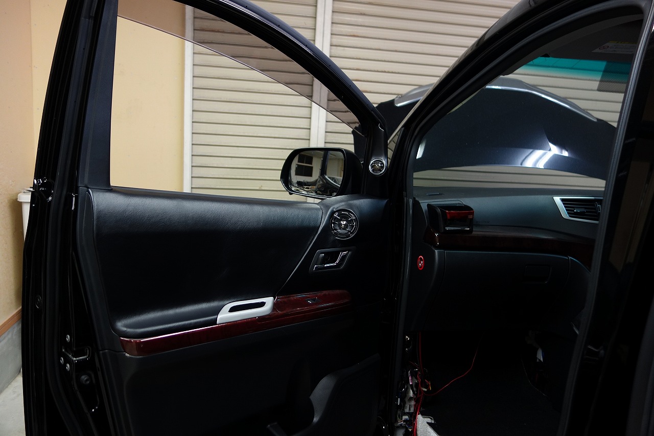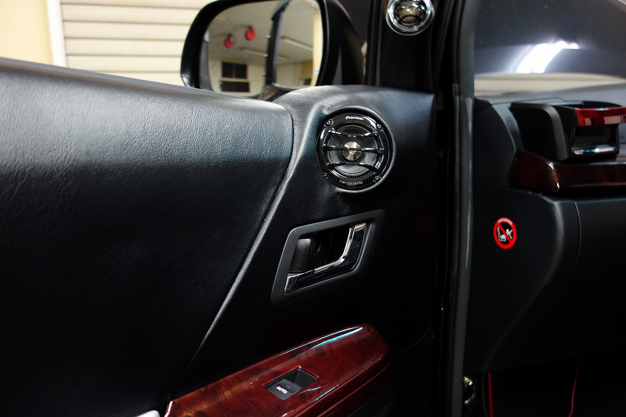トィーターは定番のドアミラー裏に取り付け、ここの場所の取り付けはシンプルな感じで仕上がるので好まれる