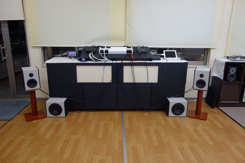 サブウーファーは床置きに見えますがインシュレーターの上にBOXが乗ってます