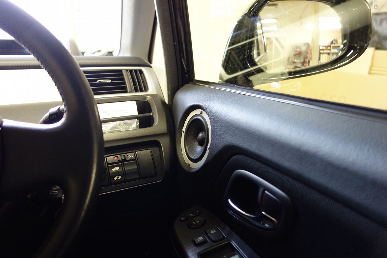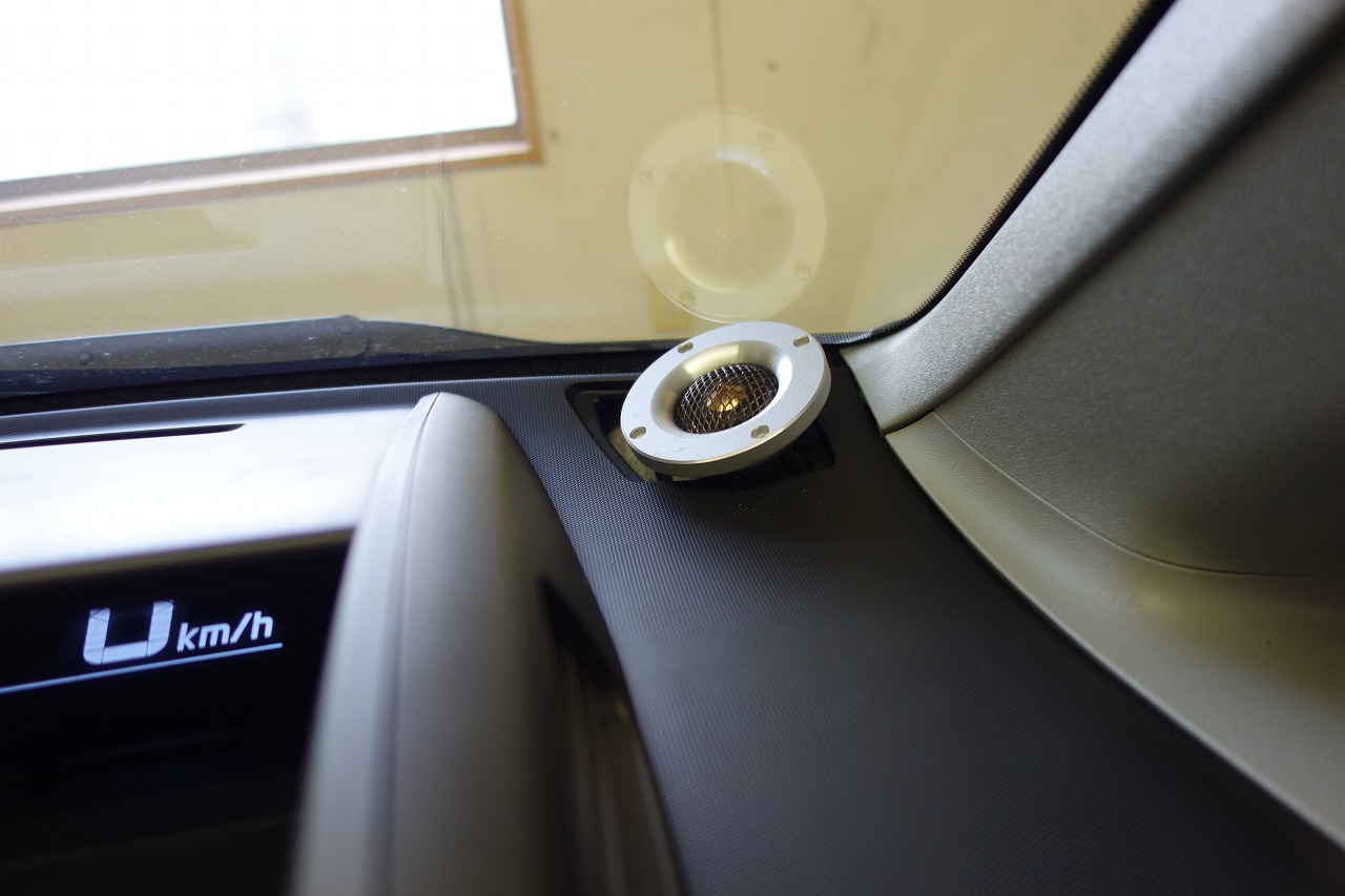 このサイズのトィーターをダッシュボードに置くとさすが違和感ありますね、ピラー制作までこの位置でがまんです!