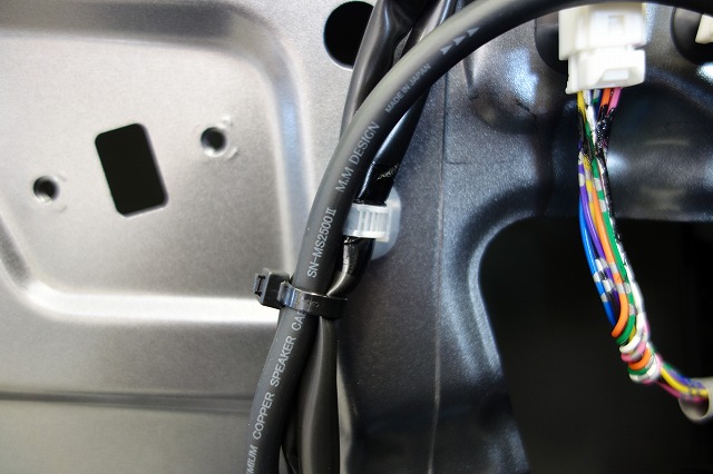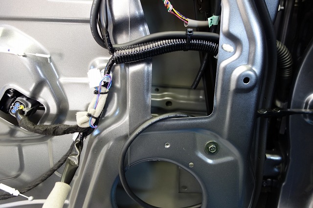 日産は車両側とドアをカプラーで繋いであるのでドア内にスピーカー線を通すのは安易ではないですがなんとリーフはカプラーの中に大きい穴が空いてるではないですか!なのでスピーカー線も被覆を剥かず余裕でドア内に引き込めます
