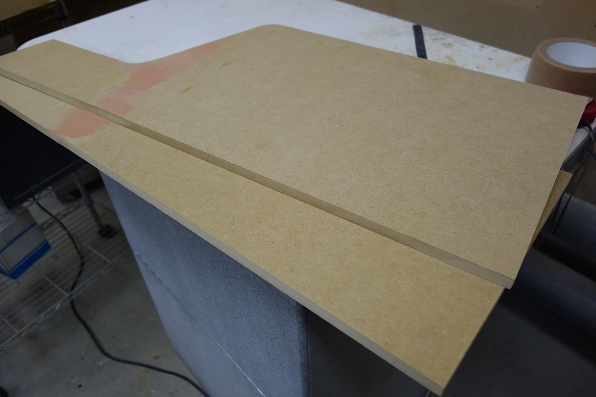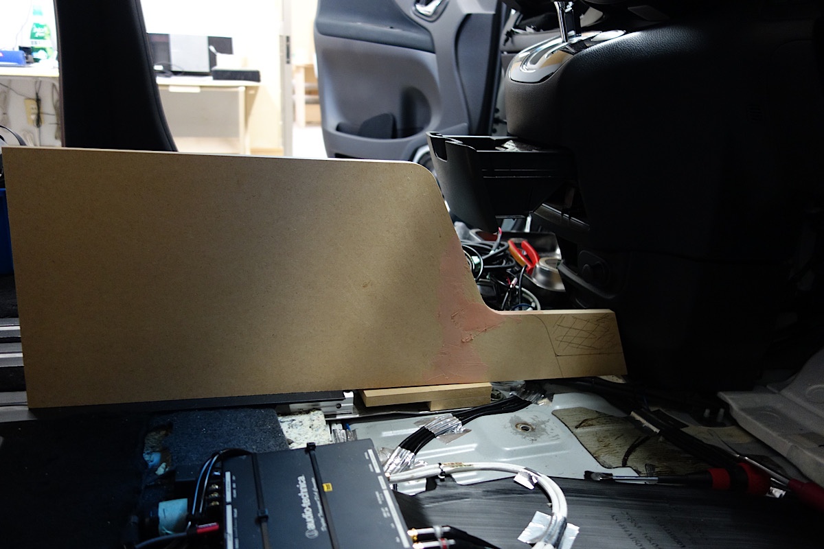 仮付けしてみたらセンターにエアコンのダクトあるじゃないですか!このままだとアンプが冷暖完備の快適な箱に収まることになるのでダクトを逃すためにもう一段下げます