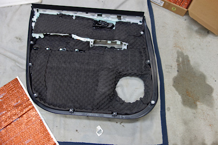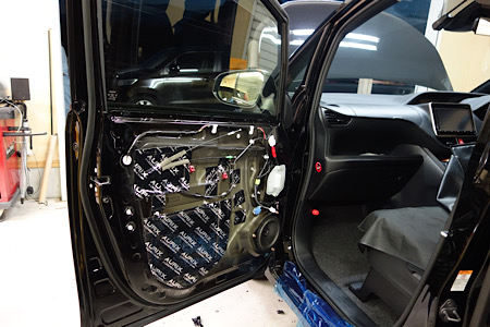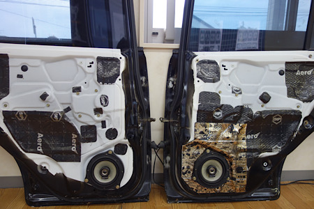 ドアに何もせずスピーカーを取り付けると鉄板の共振・裏から出た音の回り込みなどから音がキャンセリングし低域が不足になります。サービスホールを塞ぎ回り込む音を遮断することでスピーカーのおもて面から出る音だけをリスナーに伝えることができます。またドアの共振から低周波を取り除くことでクリアな音になります
