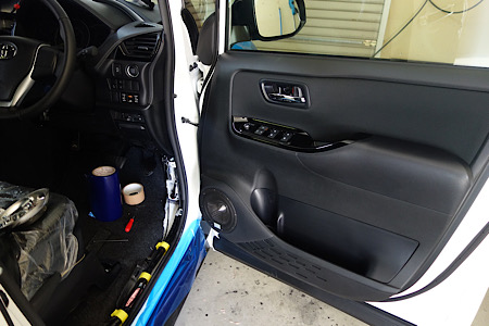 ドアから響く振動はドアトリムに伝わりドアトリムを共振させドアトリムが振動を起こし音を出します。それを防ぐためにドアトリムも制振しドア側のデッドニングしても取り除けないドアの共振音をドアトリムに吸音材を貼ることにより取り除きます