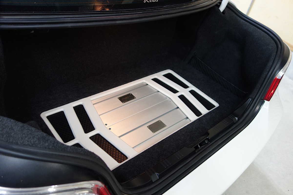 サブウーファーはスキャンスピークの22cm口径を2発を後部座席シートバックに取り付けています。2発モノラル再生じゃなくステレオ再生です