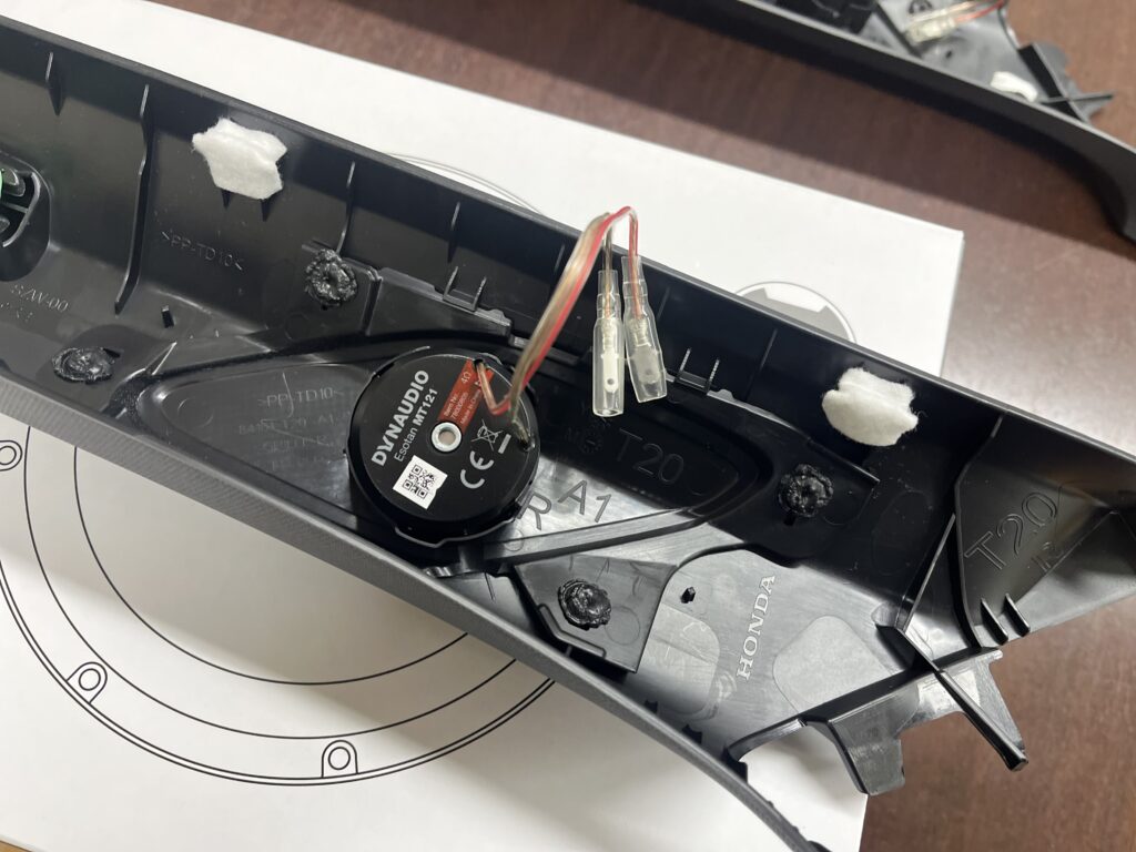 ドアは完成でトィーターは純正位置のピラーに入れます。純正のトィーターを外しその位置にDYNAUDIO ESOTANを投入