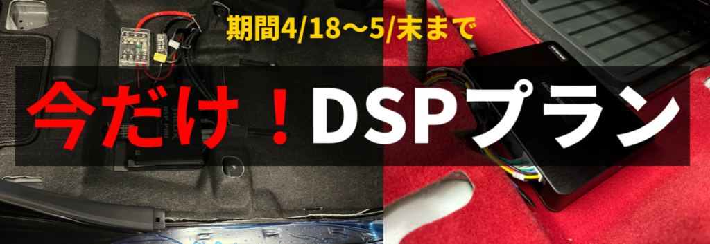 DSPプランはヘッドユニットからの音声の取り出し(ハイレベル)・バッテリーから電源引き直し・電源ケーブル・ショートパーツ・セッティング・取り付けまでがプラン内容ですが来月末までスピーカーワイヤリング・スピーカーケーブルを含んでDSPプランと同価格になるお得なプランです。上のバナーがリンクです