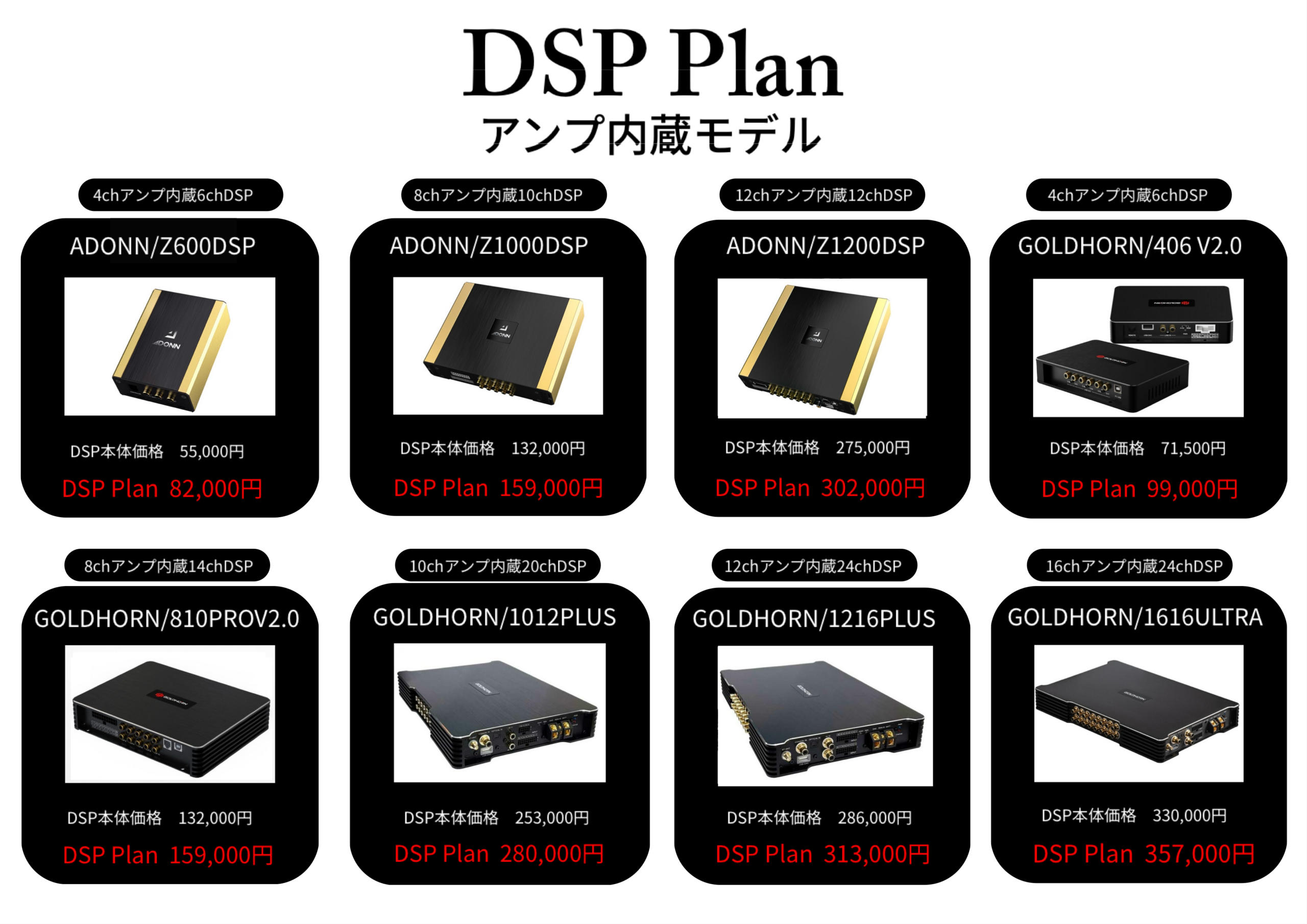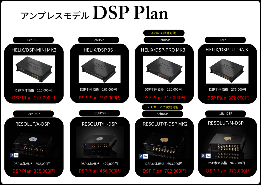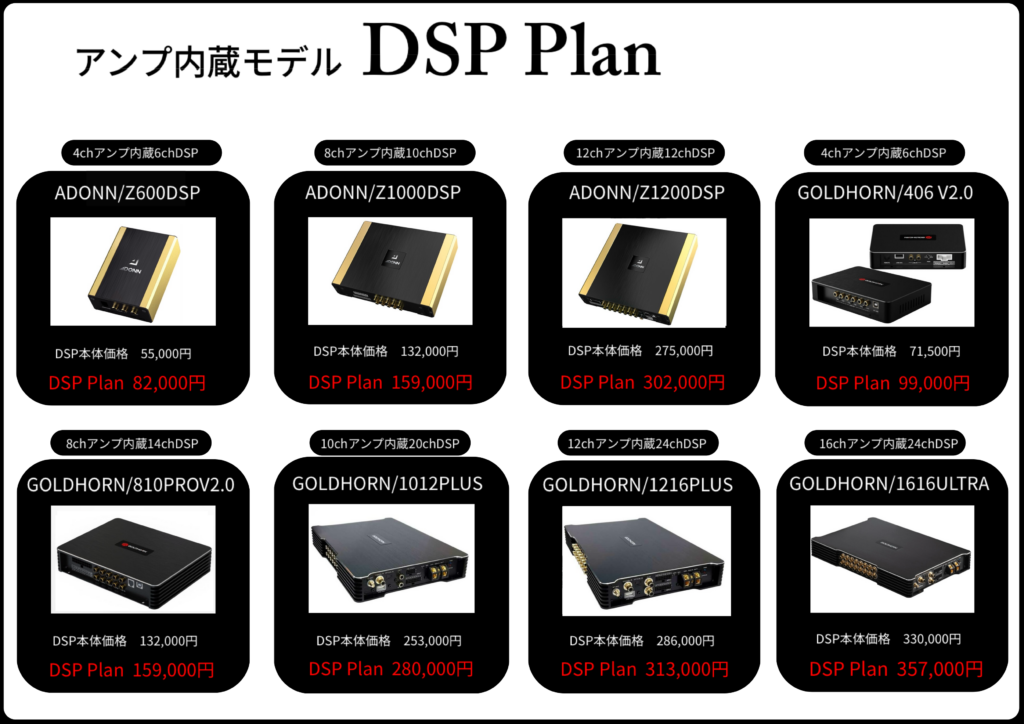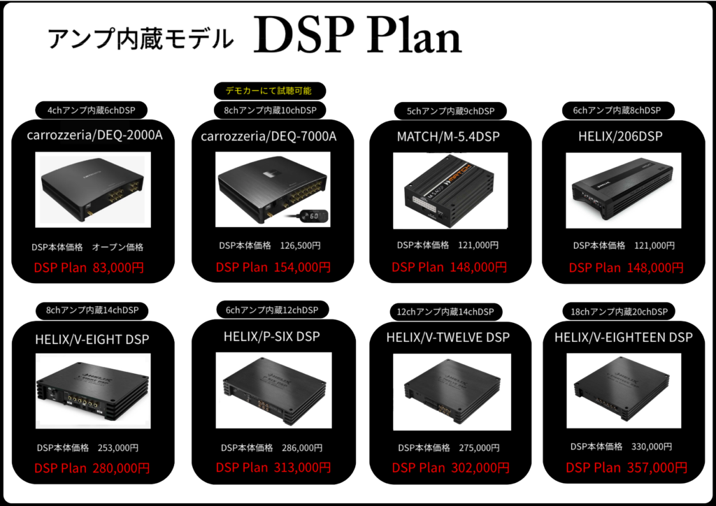 DSP Planはヘッドユニットからの音声の取り出し(ハイレベル)・バッテリーから電源引き直し・電源ケーブル・ショートパーツ・セッティング・取り付けまでのワンプライス価格になります。*DSPからスピーカーまでの配線はシステムにより異なりますのでPlanには含まれていません