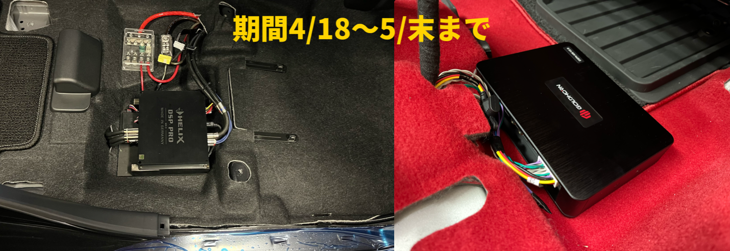 4月途中からの発信なので今月は4・5月共用です。今月はDSP「今だけ!DSPプラン」です。通常のDSPプランだと電源バッ直・ヘッドユニットからの音声取り出し・電源ケーブル・ヘッドユニットからの音声取り出しようスピーカーケーブル・ショートパーツ・セッティングが含まれています。DSPからスピーカーへのワイヤリング工賃・スピーカーケーブルは含まれていません。